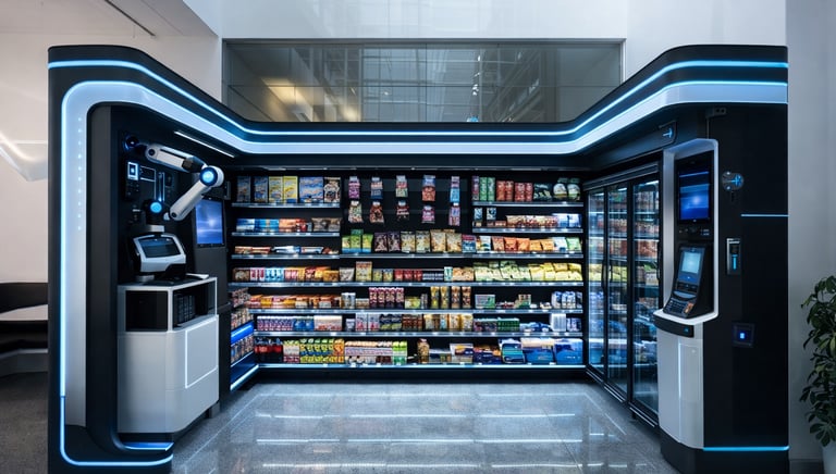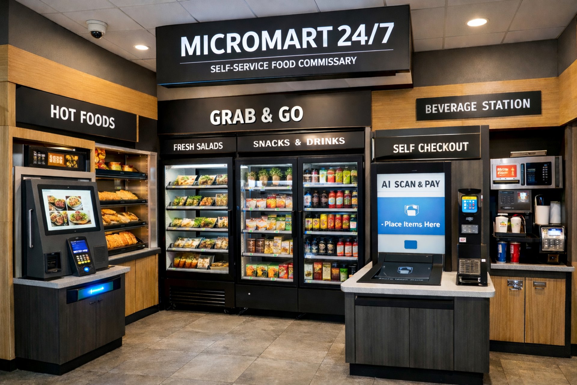 Unattended AI micromarts for busy buildings, open 24/7.